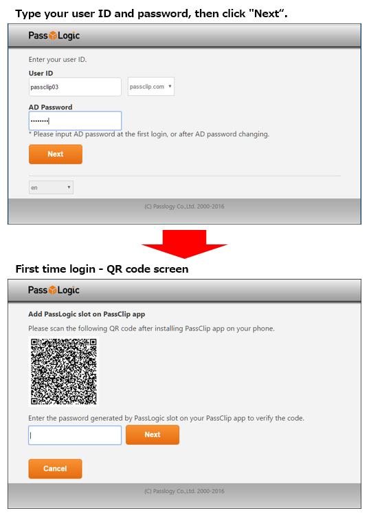 Enter your User ID and password specified by sysadmin. When you click “Next” for the first time, PassLogic screen displays the QR code.
